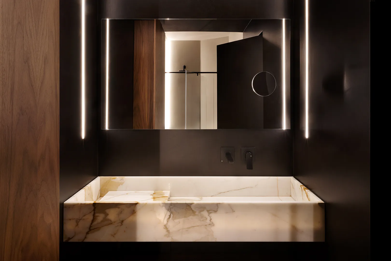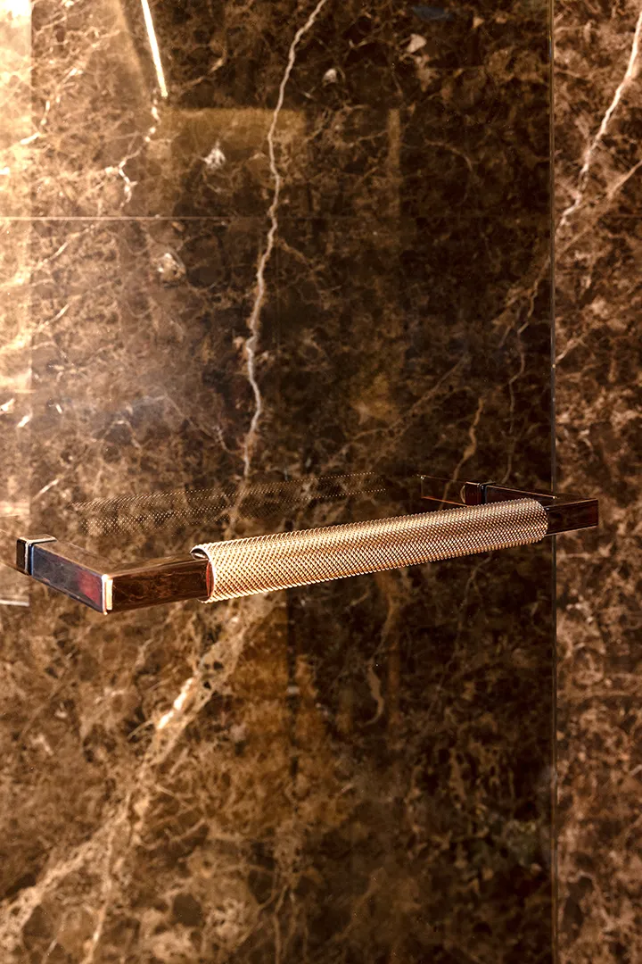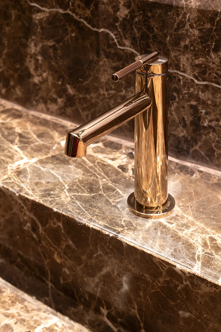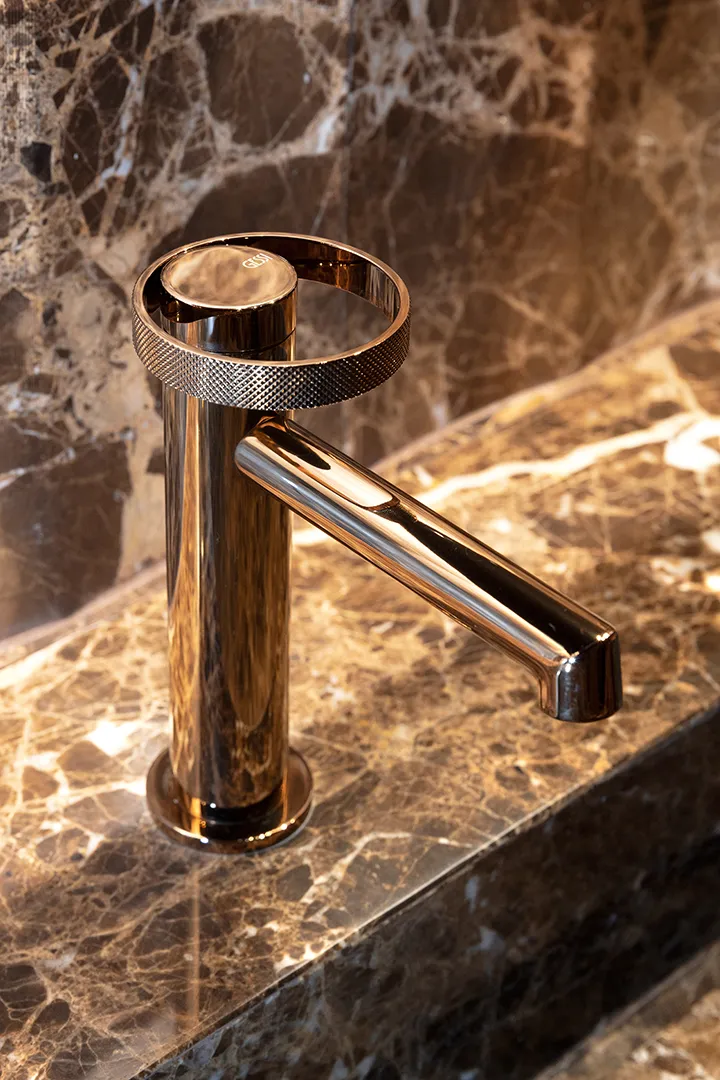 Die Residenz Le Vigne, eingebettet in die Hügel von Turin, ist das Ergebnis eines Renovierungsprojekts, das meisterhaft den Charme der Tradition mit der Kraft zeitgenössischer Ästhetik vereint. Die Räume, neu gestaltet, um Funktionalität und Harmonie zu gewährleisten, zeichnen sich durch einen entschiedenen und raffinierten Charakter aus. Eine strategische Entscheidung war die Wahl der Gessi-Kollektionen: Afilo, Ingranaggio Anello, Shower G, die Private Wellness-Wasserfälle, Tremillimetri und Rilievo werden zu Protagonisten der architektonischen Sprache. Nicht einfache Ergänzungen, sondern wahre Designinstrumente, die die Philosophie des Projekts verkörpern: technologische Innovation, formale Reinheit und Sinnlichkeit zu vereinen. Die minimale Präzision von Afilo, die Ausdruckskraft von Rilievo, die szenografische Flüssigkeit der Wasserfälle und die extreme Leichtigkeit von Tremillimetri treten in Dialog mit der Materialität der Marmore und der warmen Eleganz des nationalen Nussbaums und schaffen einzigartige Räume voller Intensität und Atmosphäre. Schwarze Wände und Decken, sorgfältig abgestimmte Beleuchtung und ausgewählte Designmöbel vervollständigen einen Kontext, der die Identität der Residenz hervorhebt: ein exklusiver Raum, in dem jedes Detail – von den Oberflächen bis zu den von Gessi signierten Wasserelementen – Gleichgewicht, Persönlichkeit und Leidenschaft für Design ausdrückt. Photo credits: Barbara Corsico