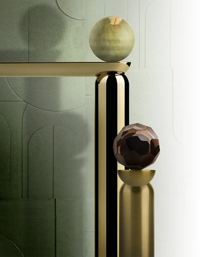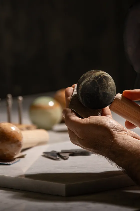 Le Pietre Naturali, lavorate con la cura di un maestro gioielliere, trasformano marmo e onice in sculture preziose che ne esaltano venature e colori. La materia prima, estratta da cave naturali, viene modellata e lucidata a mano, diventa un’opera d’arte unica. Materiali come Dark Emperador, Onice Cola e Onice Verde si trasformano in sfere perfette, simbolo di purezza e lusso senza tempo.
