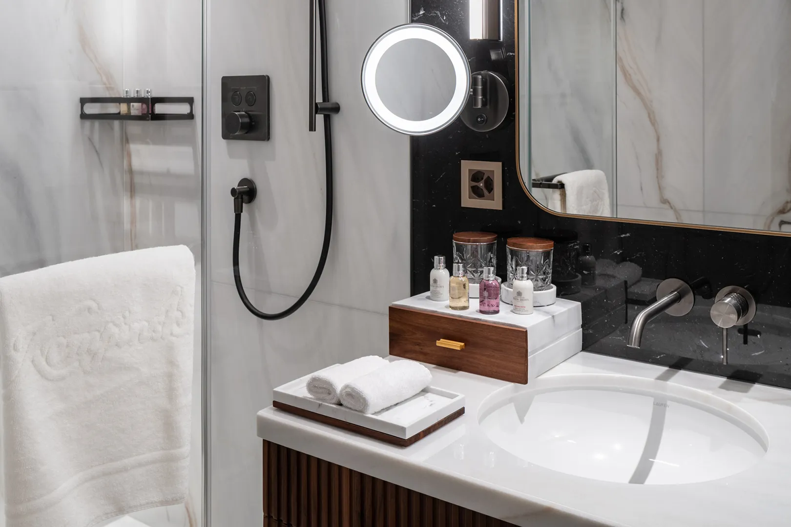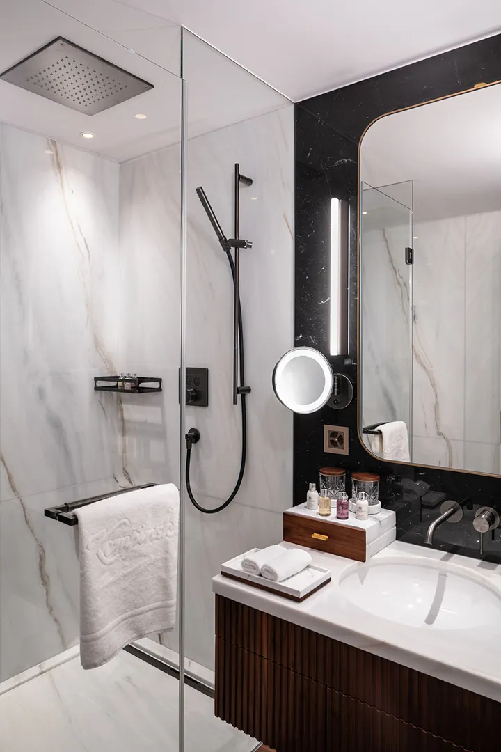 Along the clear waters of the Mauritius spring, which for centuries have offered well-being and renewal to travelers and aristocracies, rises the Grand Hotel des Bains Kempinski. Embraced by the snow-covered profiles of the Engadin, this nineteenth-century jewel merges with the mountain like a fragment of its very beauty. From this spring flows an invisible thread that weaves through time: water, a vital principle and a gesture of balance between body and spirit. It is along this same thread that Gessi’s vision intertwines, translating the dialogue between nature and design into its own art of well-being. In every detail, one finds the purity of an authentic, discreet, and profoundly human luxury. Thus, Gessi creations move like tailor-made gestures, giving voice to the soul of the place and allowing water to shape forms in dialogue with the landscape and those who inhabit it. The HIFI Comfort, Gessi316 in the Intreccio variant, and Shower G collections reflect this sensitivity in luminous surfaces and tactile finishes capable of welcoming and returning light. Mechanisms, plates, and accessories complete the composition with balance and measure, creating a coherent total look where every detail contributes to an experience of intimacy and essential beauty, while Inciso enriches the bathrooms of the renowned Billionaire with personality, outlining a narrative of exclusivity.